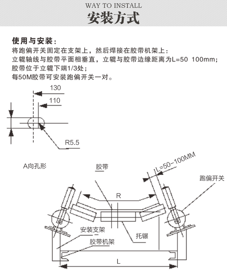 运动中的胶带发生跑偏时,胶带边缘带动立辊旋转并挤压立辊使之倾料。若立辊倾大于一级动作角度时,立即发出一组开关信号,如立辊倾大于二级动作角度时,侧输出一组开关信号。两组开关信号可分别用于警告或停机,胶带机恢复正常运行后,立辊自动复位。五,安装调整:1.将跑偏开关固定在支架上,然后安装在胶带机架上。2.立辊轴线与胶带平面相垂直,立辊与胶带边缘距离为L=50-100MM3.胶带位于立辊下端1/3处4.每一百米胶带可安装跑偏开关3-6台。
