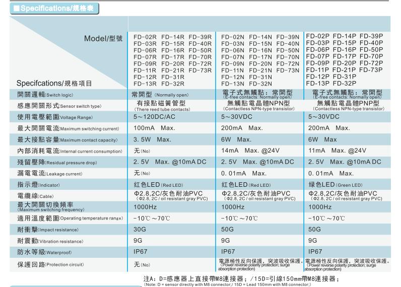 FD-20R 弹簧管/常开型 5-240DC/AC 10W/100mA Max.FD-20N 无触点NPN/常开型 5-30VDC 6W/100mA Max.FD-20P 无触点PNP/常开型 5-30VDC 6W/100mA Max