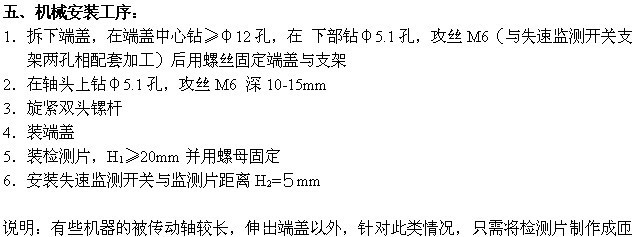 检测片尺寸100×10×2mm,材料普通铁皮,片数种类有2片、4片、6片等多种。失速监测开关的安装位置视具体情况而定,在不影响正常工作的前提下只要满足“给探头单位时间内均匀的脉冲信号”这个条件即可,也就是说被传动轴侧安装一个检测物能给探头信号。