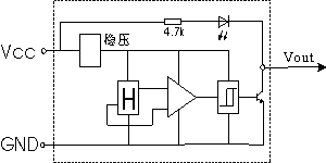 霍尔开关电路的输出级一般是一个集电极开路的NPN晶体管,其使用规则和任何一种相似的NPN开关管相同。输出管截止时,输漏电流很小,一般只有几nA,可以忽略,输出电压和其电源电压相近,但电源电压最高不得超过输出管的击穿电压(即规定的极限电压28V)。输出管导通时,它的输出端和线路的公共端短路。因此,必须外接一个电阻器(即负载电阻器)来限制流过管子的电流,使它不超过最大允许值(一般为100mA),以免损坏输出管。输出电流较大时,管子的饱和压降也会随之增大,使用者应当特别注意,仅这个电压和你要控制的电路的截止电压(或逻辑“零”)是兼容的
