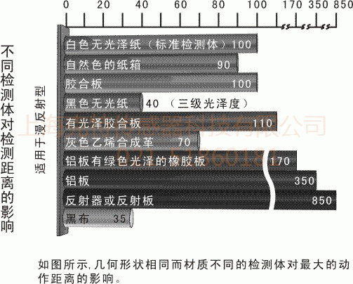 对于漫反射型光电传感器发出的光线需要被检测物表面将足够的光线反射回漫反射传感器的接受器,所在检测距离和被检测物体的表面反射率将是决定接受器接收到光线的强度大小,粗糙的表面反射回的光线必将小于光滑表面反射回的强度,而且,被检测物体的表面必须垂直于光电传感器的发射光线。常用材料的反射率参考图如下所示: